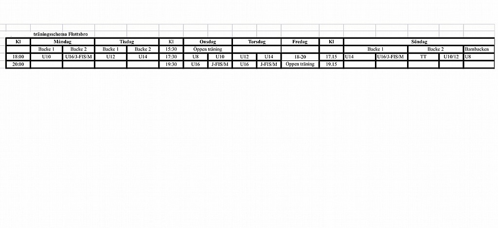 Så här ser träningsschemat ut i år. Vi har tillgång till både första backen, barnbacken och vår vanliga tävlingsbacke enligt schemat i år.